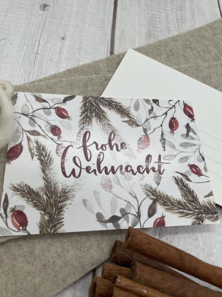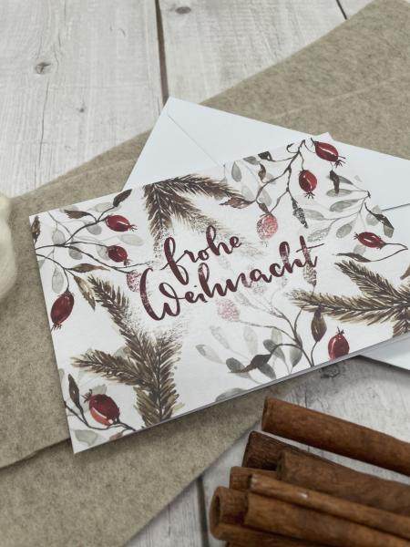 Die Vorderseite ist mit einem floralen Motiv aus Hagebutten und Tannenzweigen sowie dem Wunsch "frohe Weihnacht" bedruckt.