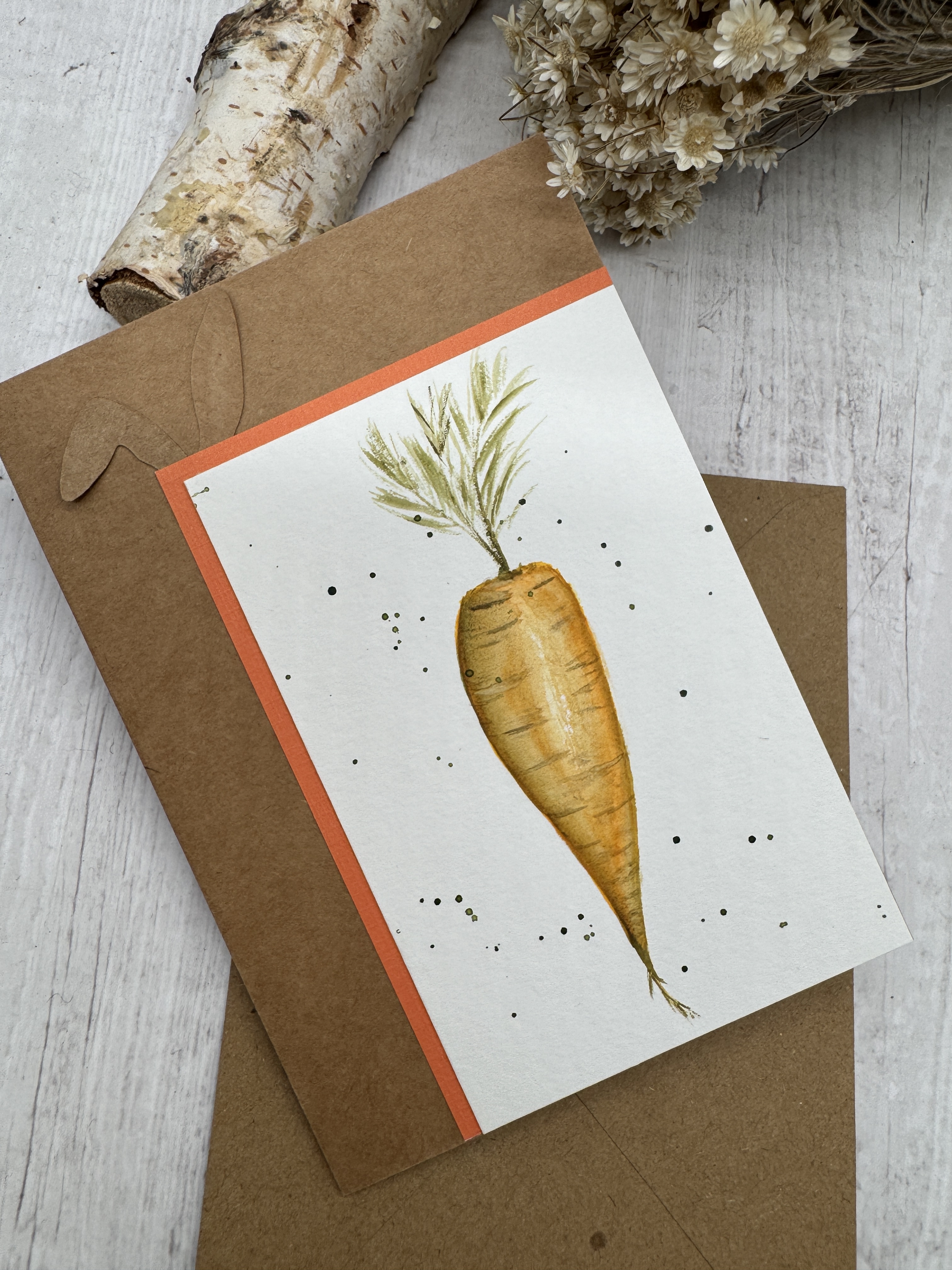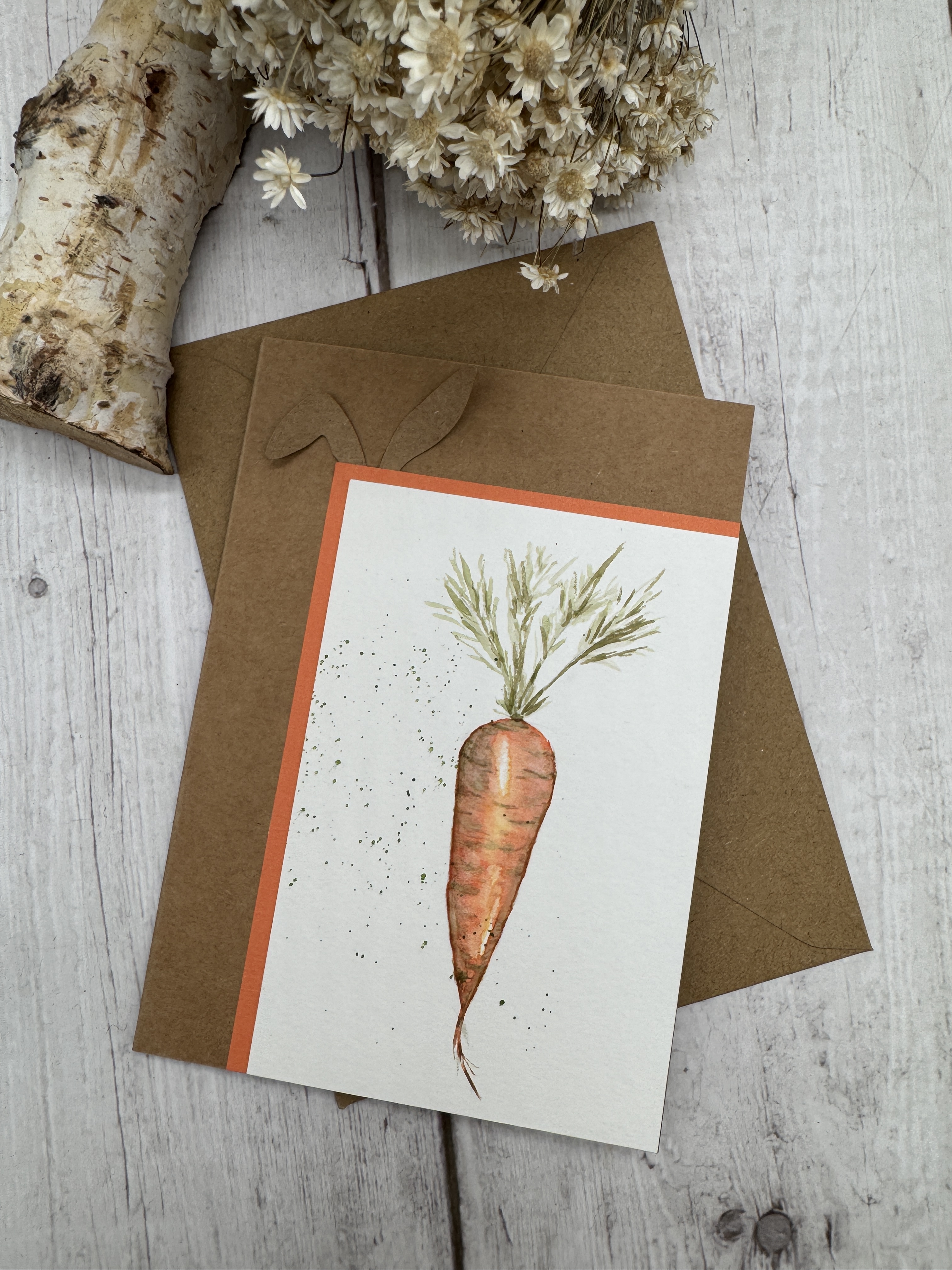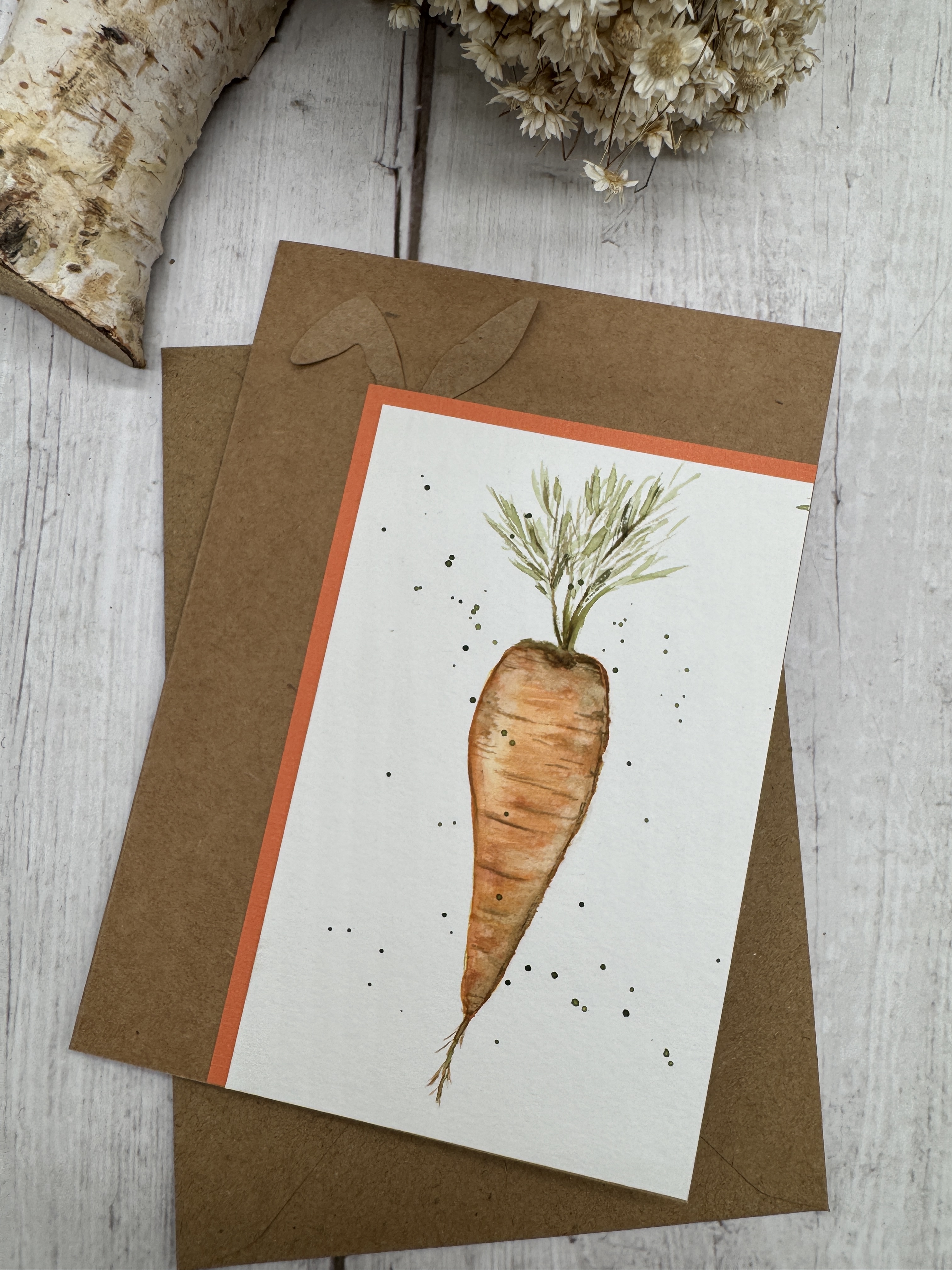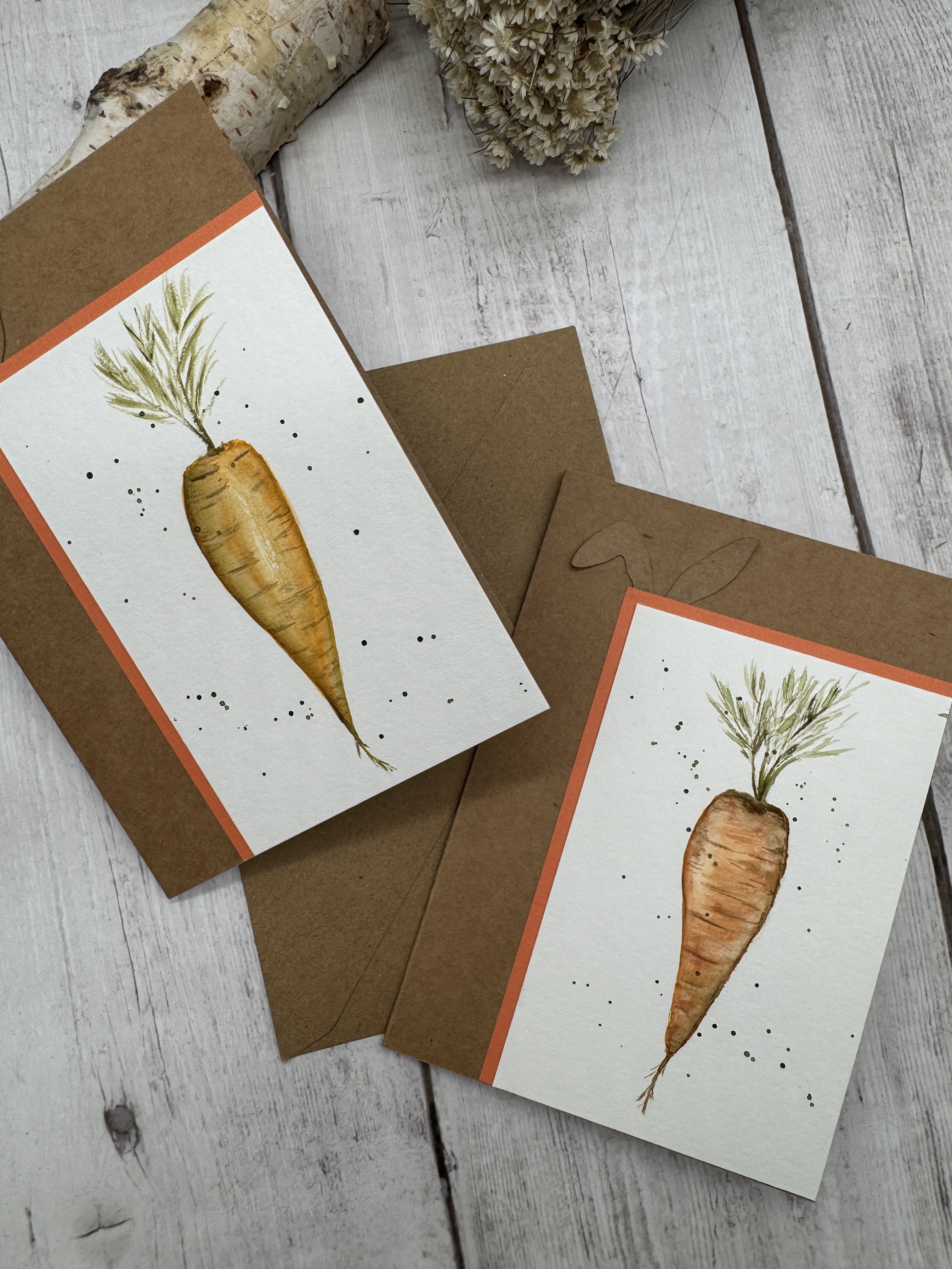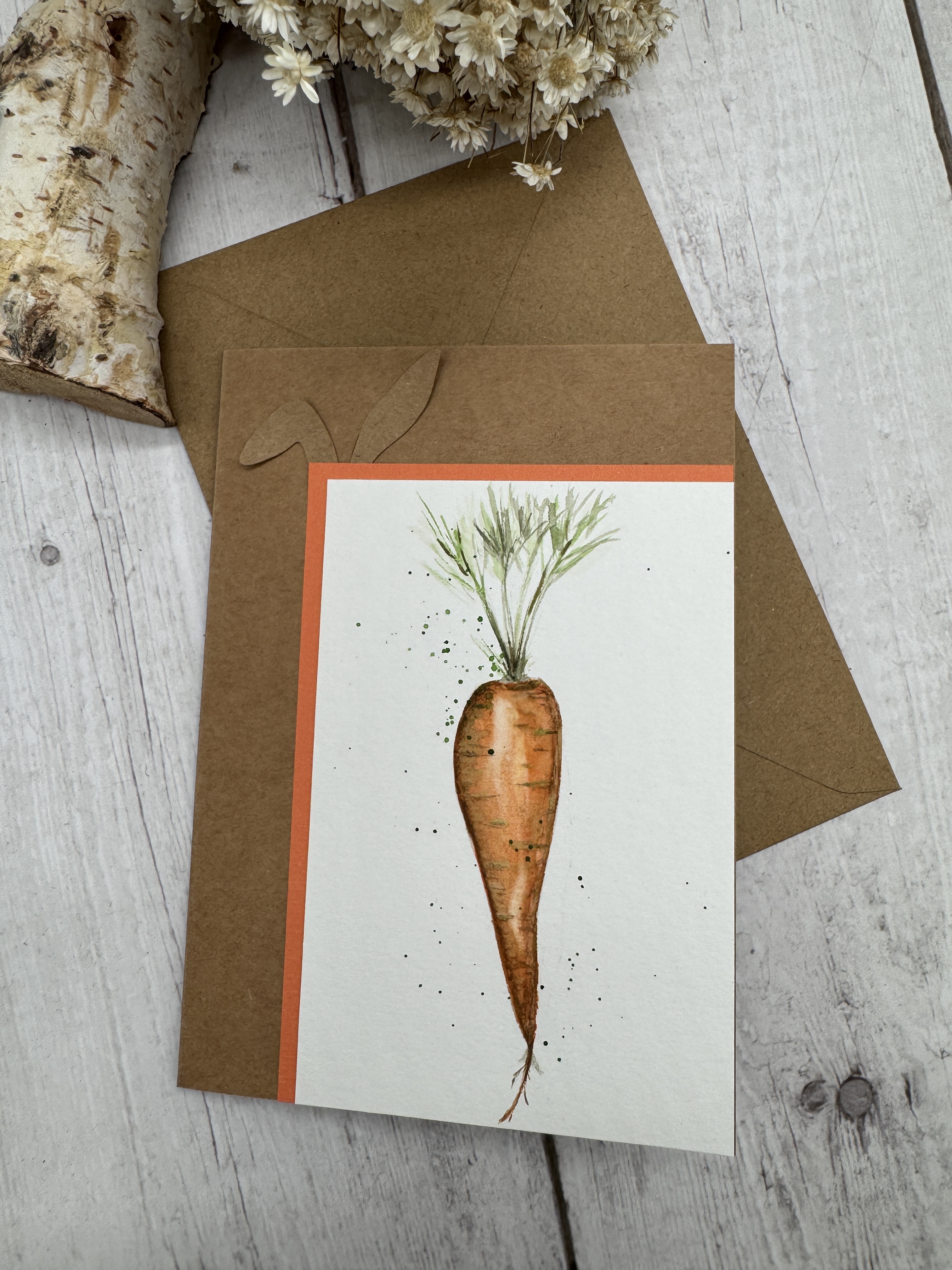 Jede Karte ist handgemalt, die Motive ähnlich und trotzdem ganz anders. Farbe und Form der Karotte werden immer verschieden sein, genau wie das Gemüse aus dem Beet. Einen schicken Rahmen setzt das farblich passende Passepartout im Hintergrund. Das Osterhäschen hat sich auch in der Karte versteckt - die Ohren luken noch hervor!