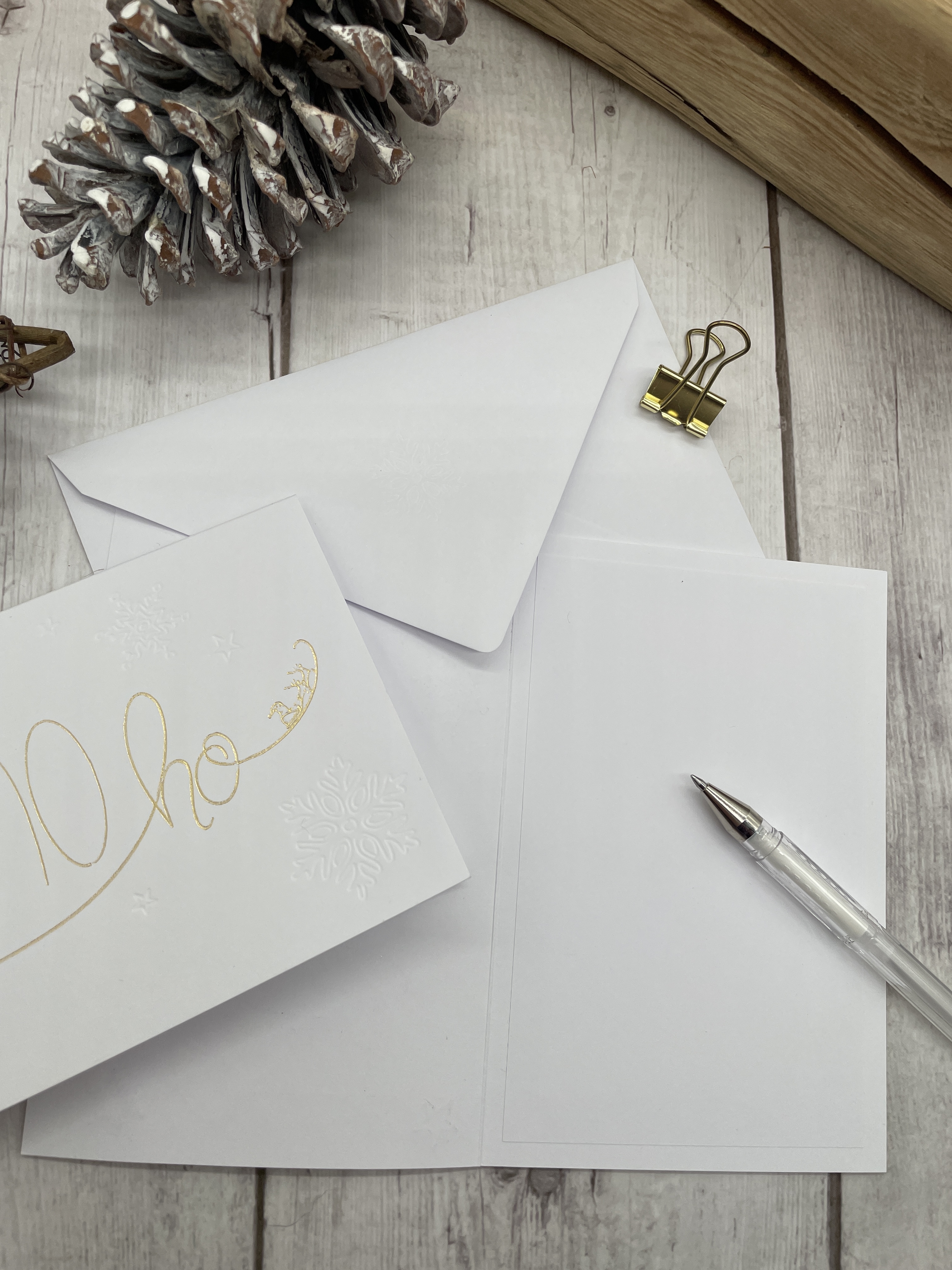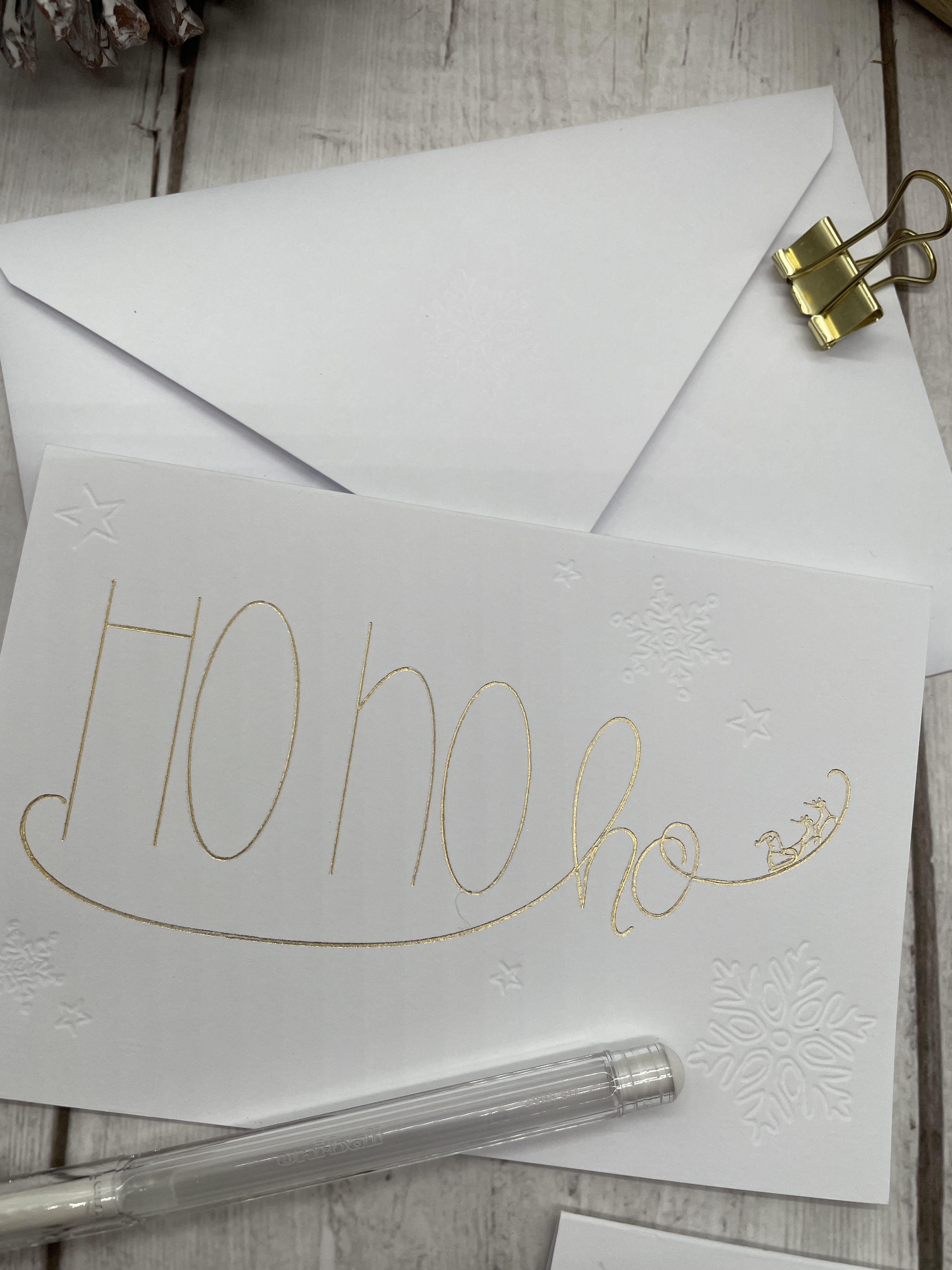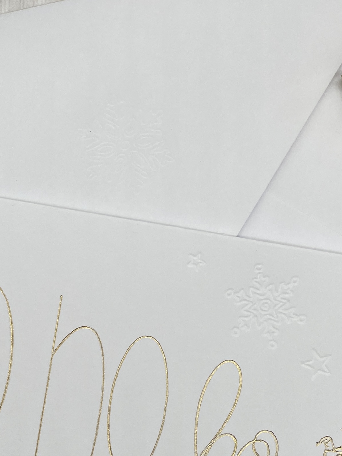 Die direkt in die Karte geprägten Schneeflocken verbreiten winterliche Stimmung, die Goldfolierung sorgt für den stimmungsvollen Weihnachtsglanz. Und wer genau hinsieht, der findet auch Santa auf seinem Schlitten ;-)