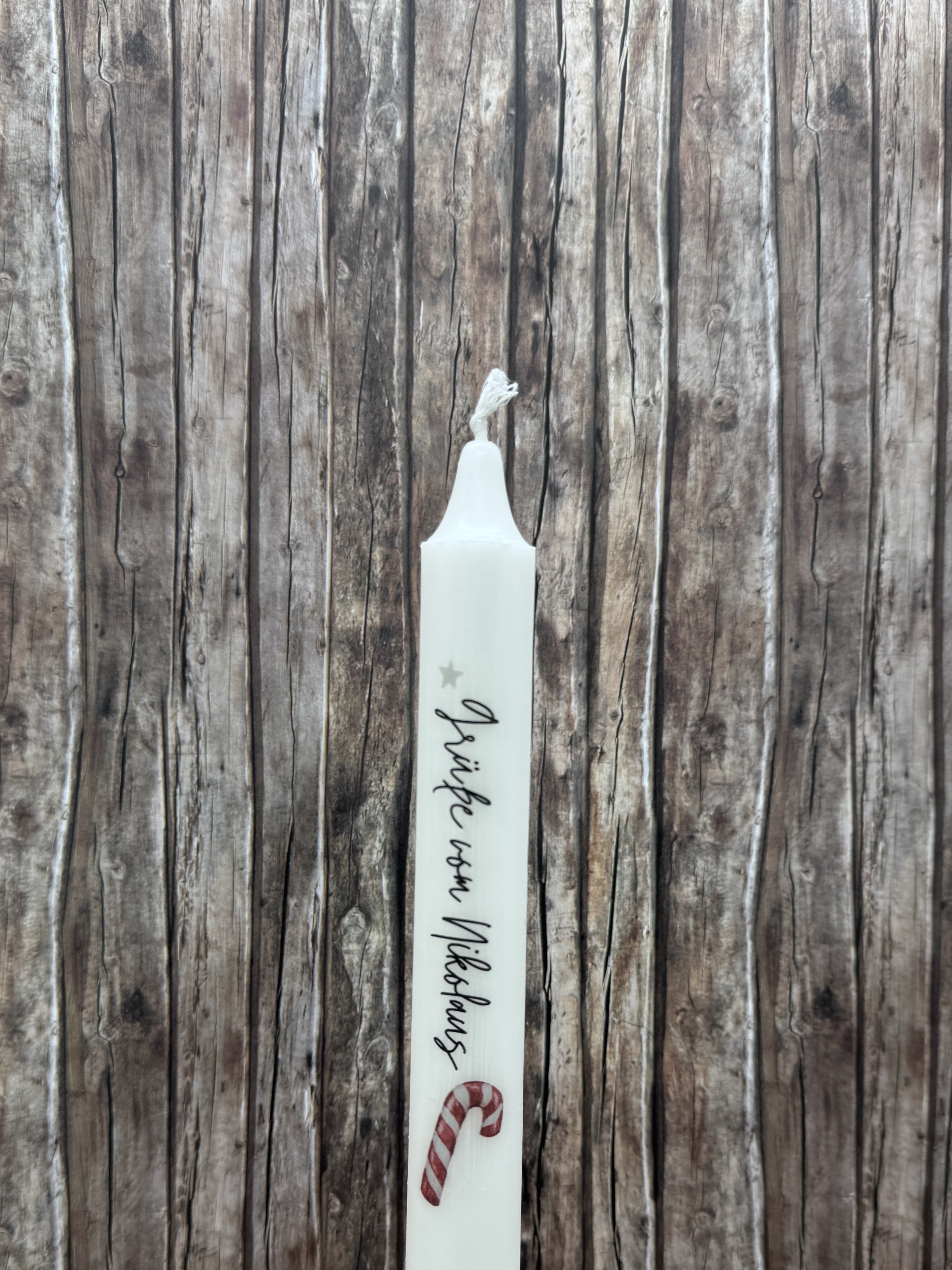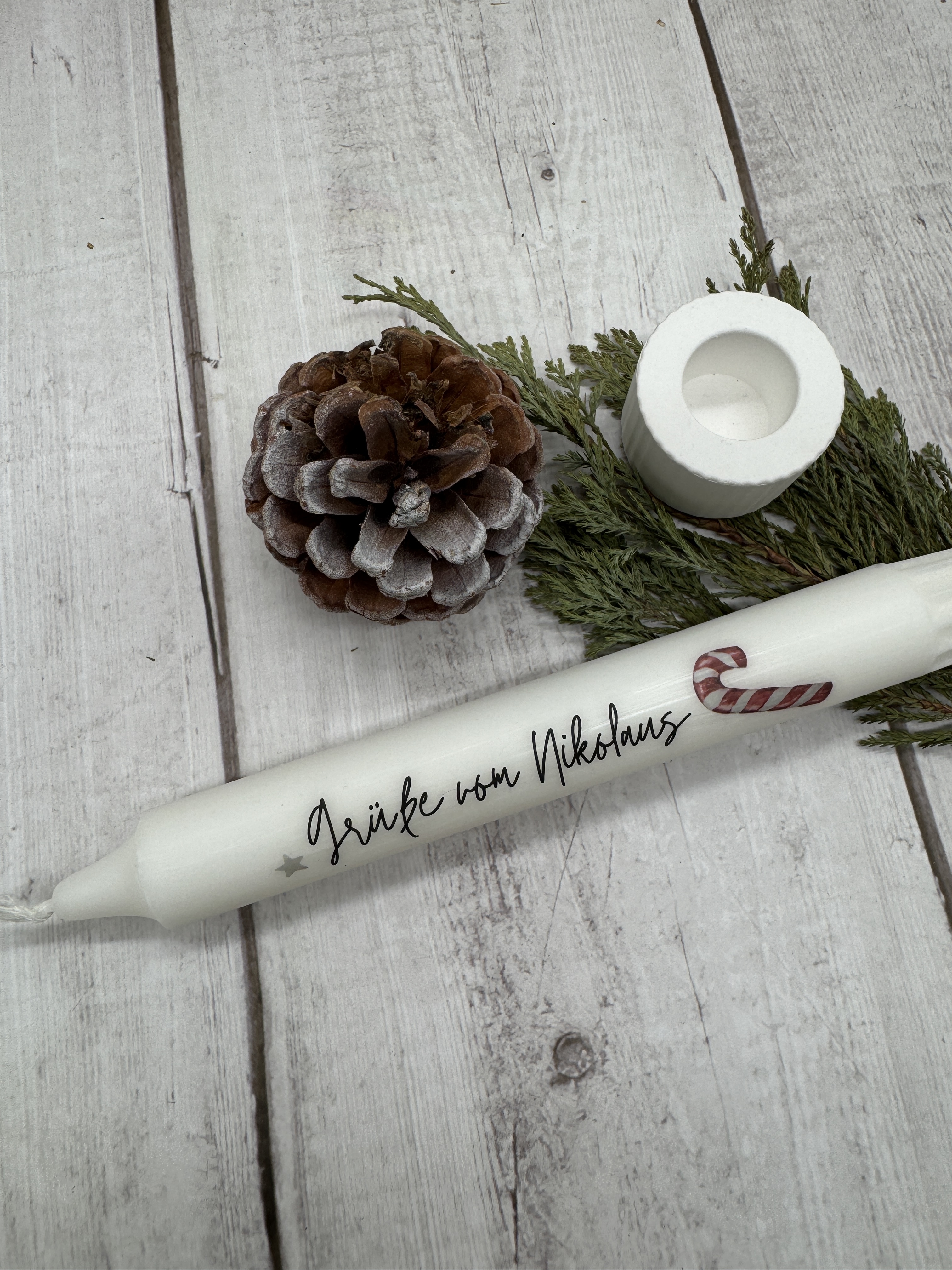 1 schlichte, weiße Kerze, beschriftet mit einem kleinen Gruß vom Nikolaus sowie Zuckerstangen-Motiv.