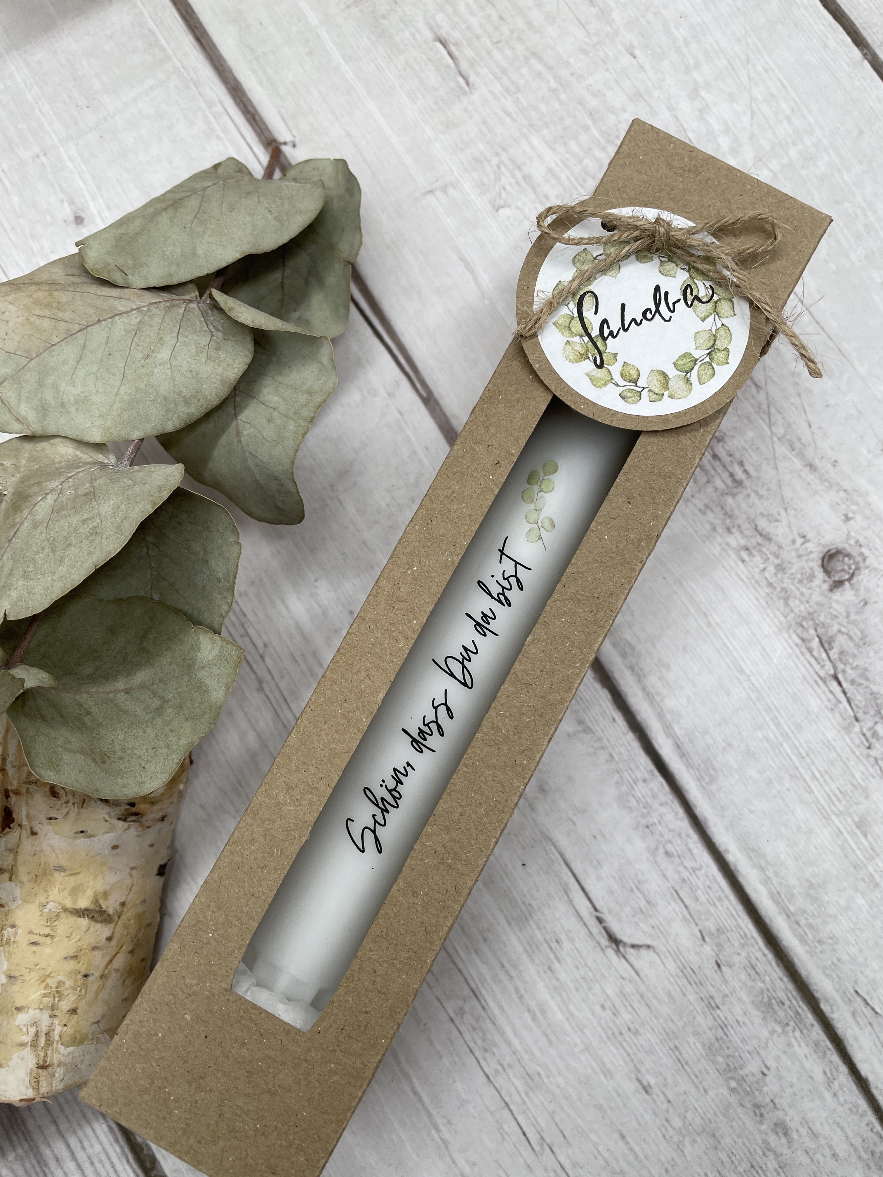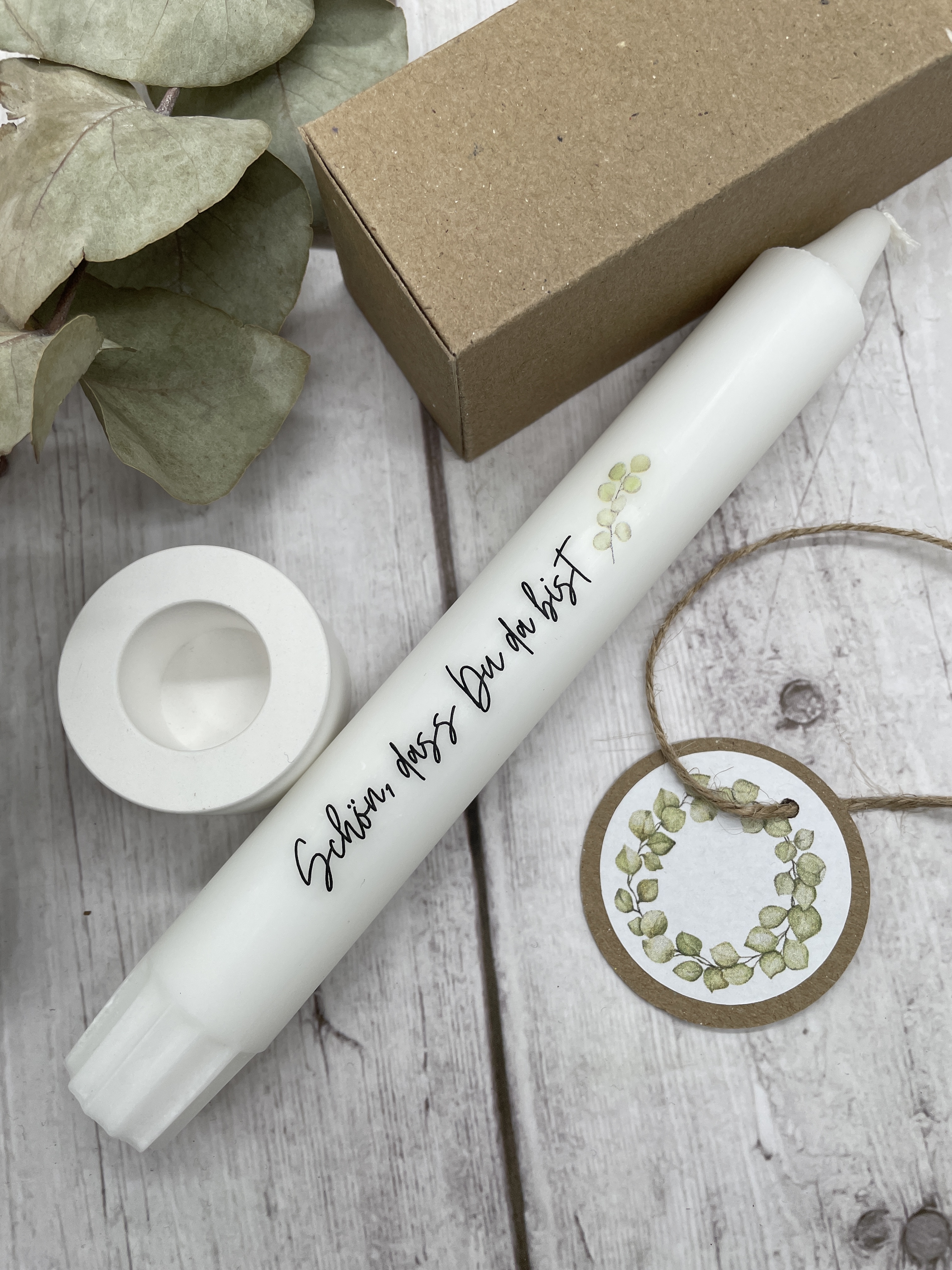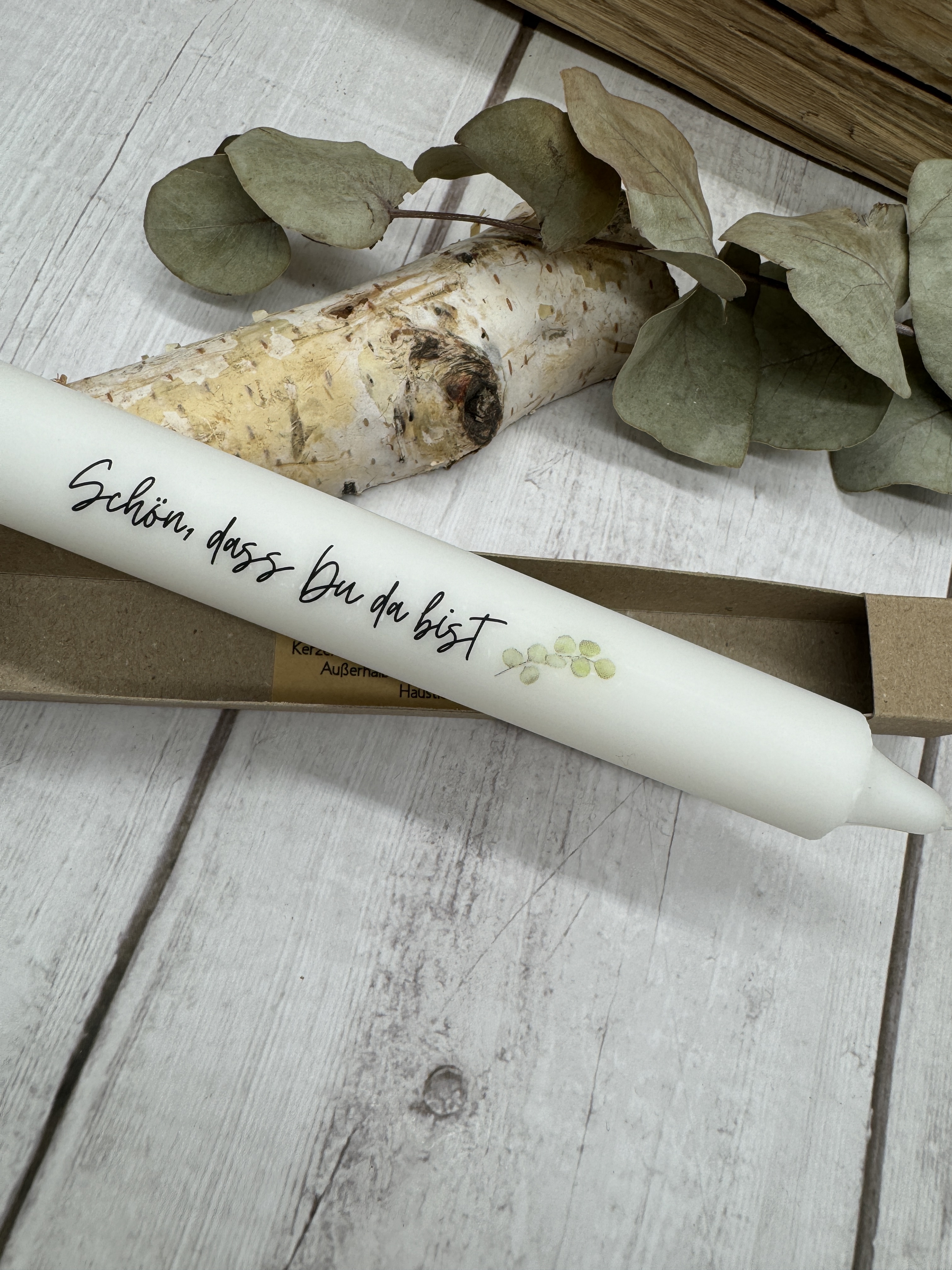 Kerze: schön, dass Du da bist - fertig als Geschenk verpackt in 2 Varianten