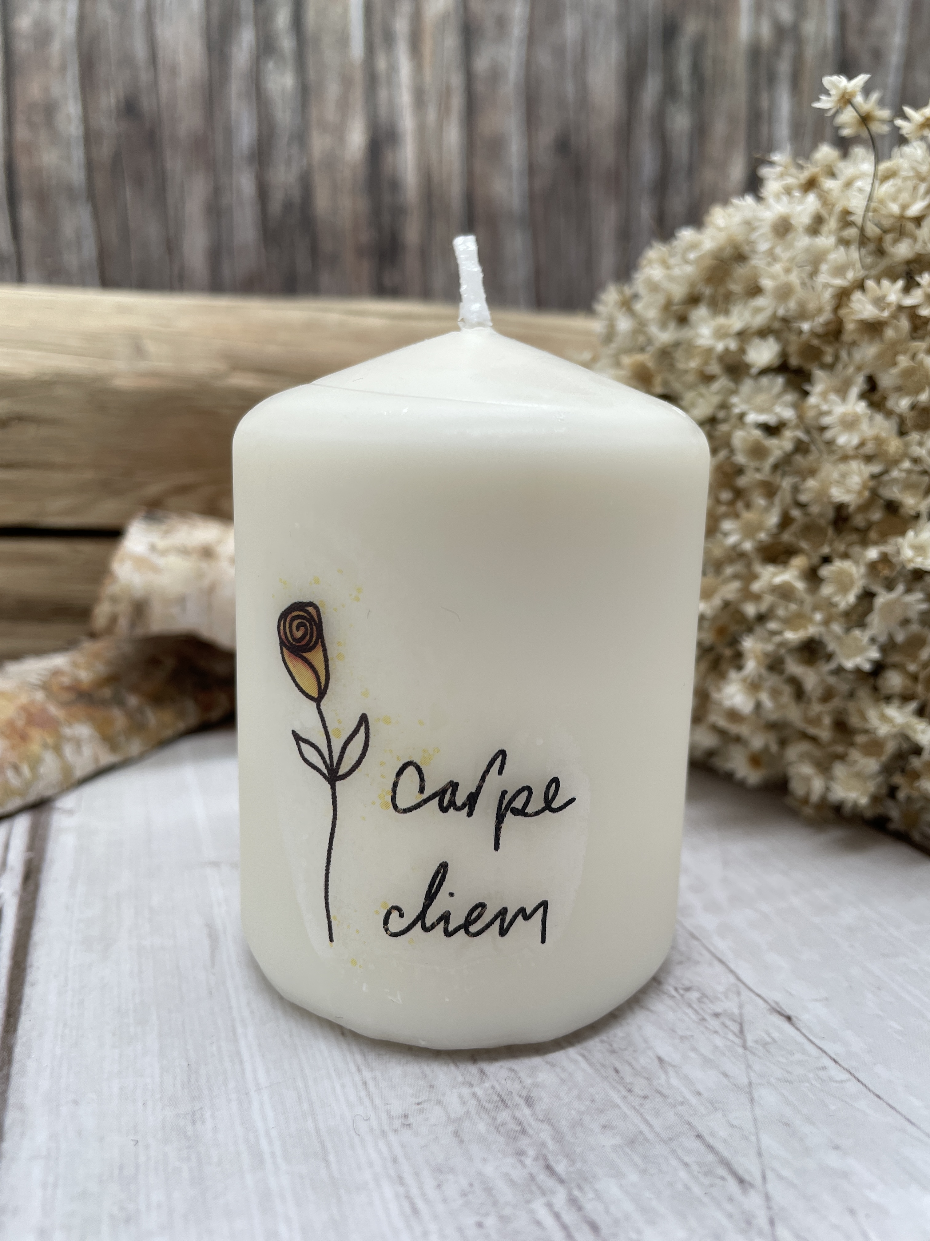 Die im HiwwelWerk designten Motive werden von Hand mit Wasserschiebefolie auf die Kerze aufgebracht und mit Kerzenlack versiegelt. Die Folie schmilzt an der Außenseite der Kerze beim Abbrennen im Wachs mit ein. Die Folie selbst ist nicht kratzfest.
