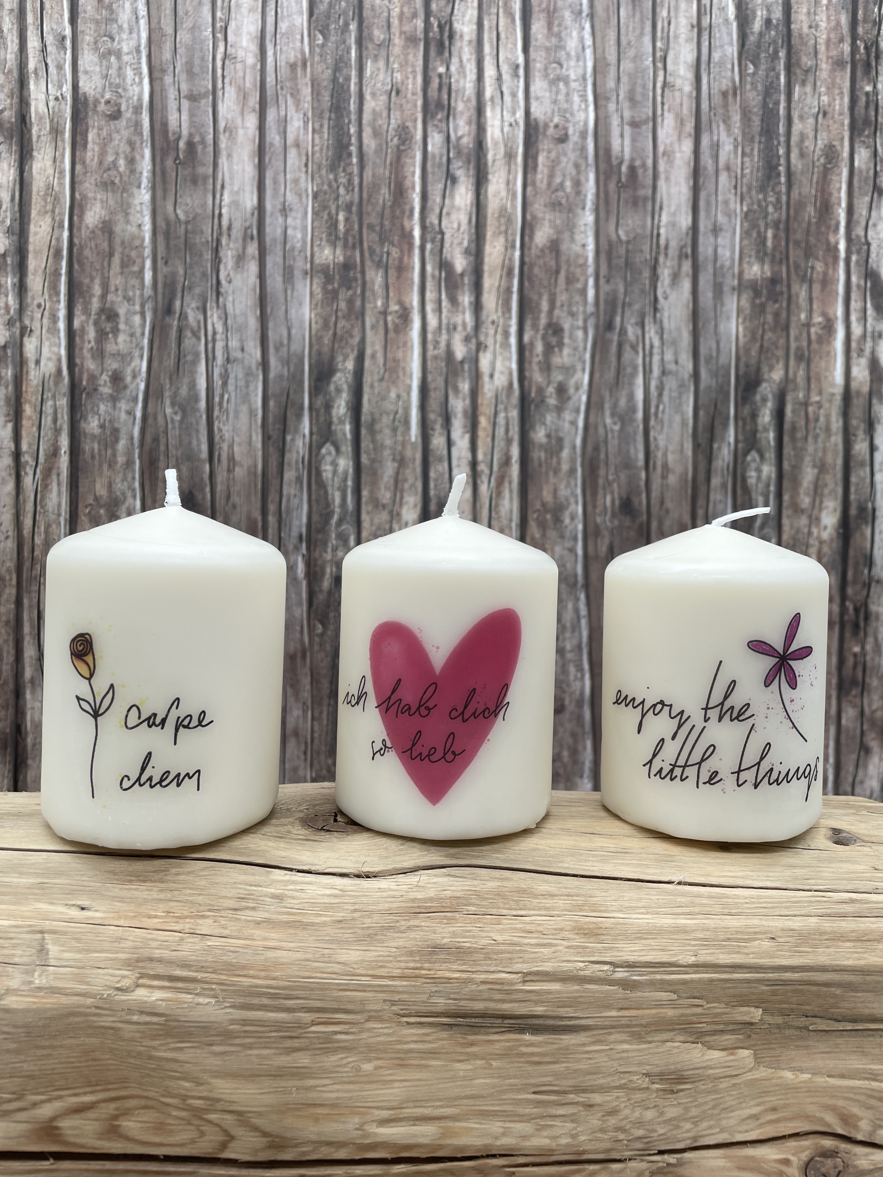 3 Kerzen mit tollen neuen Motiven aus einer Kombi von Aquarell und Oneline-Art.