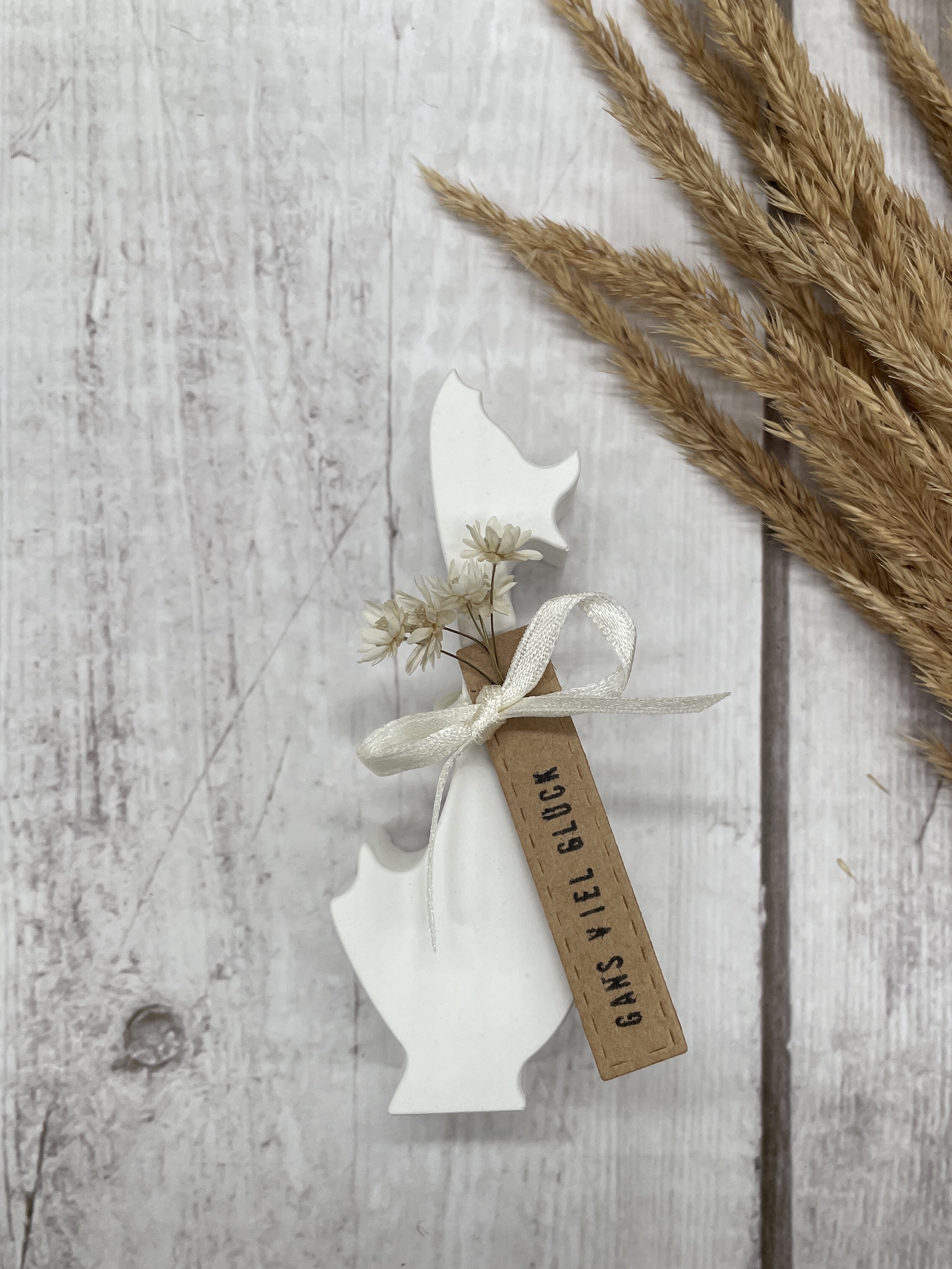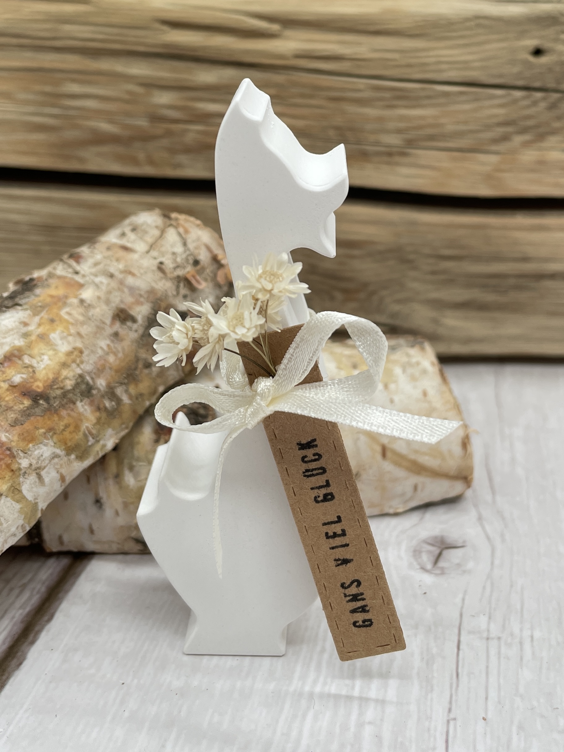 Ob zum Geburtstag, Jubiläum oder für ein bisschen Unterstützung bei einer wichtigen Prüfung wünscht die kleine Gans mit einem bestempelten Anhänger aus Kraftpapier und ein paar Trockenblümchen eben genau das: Gans viel Glück!