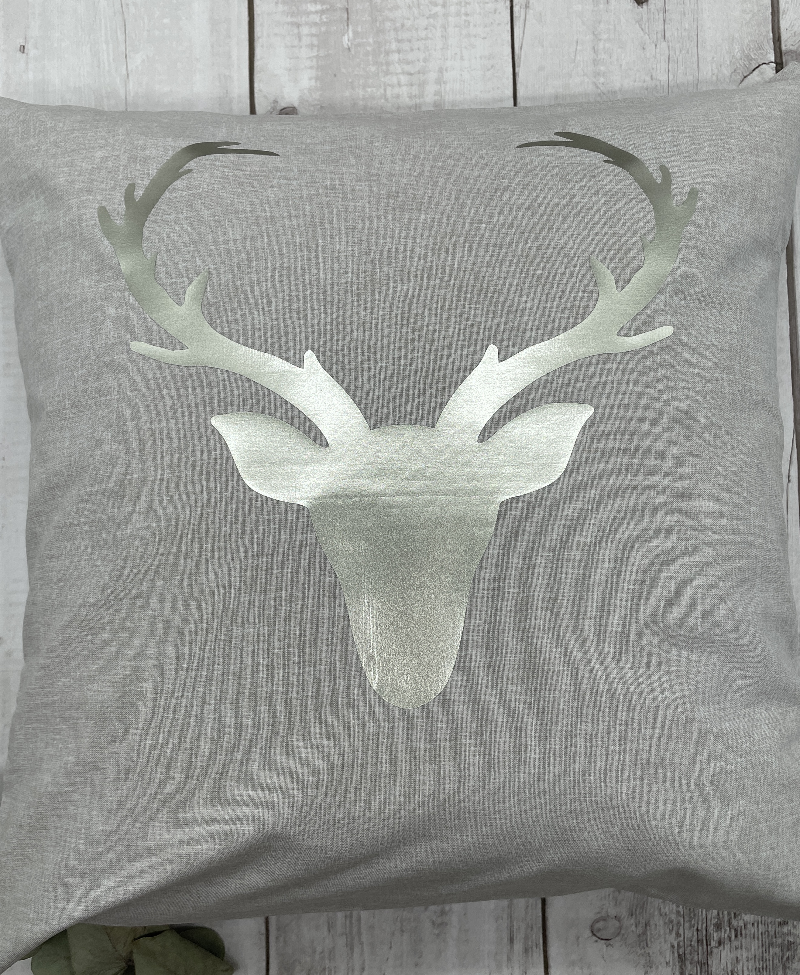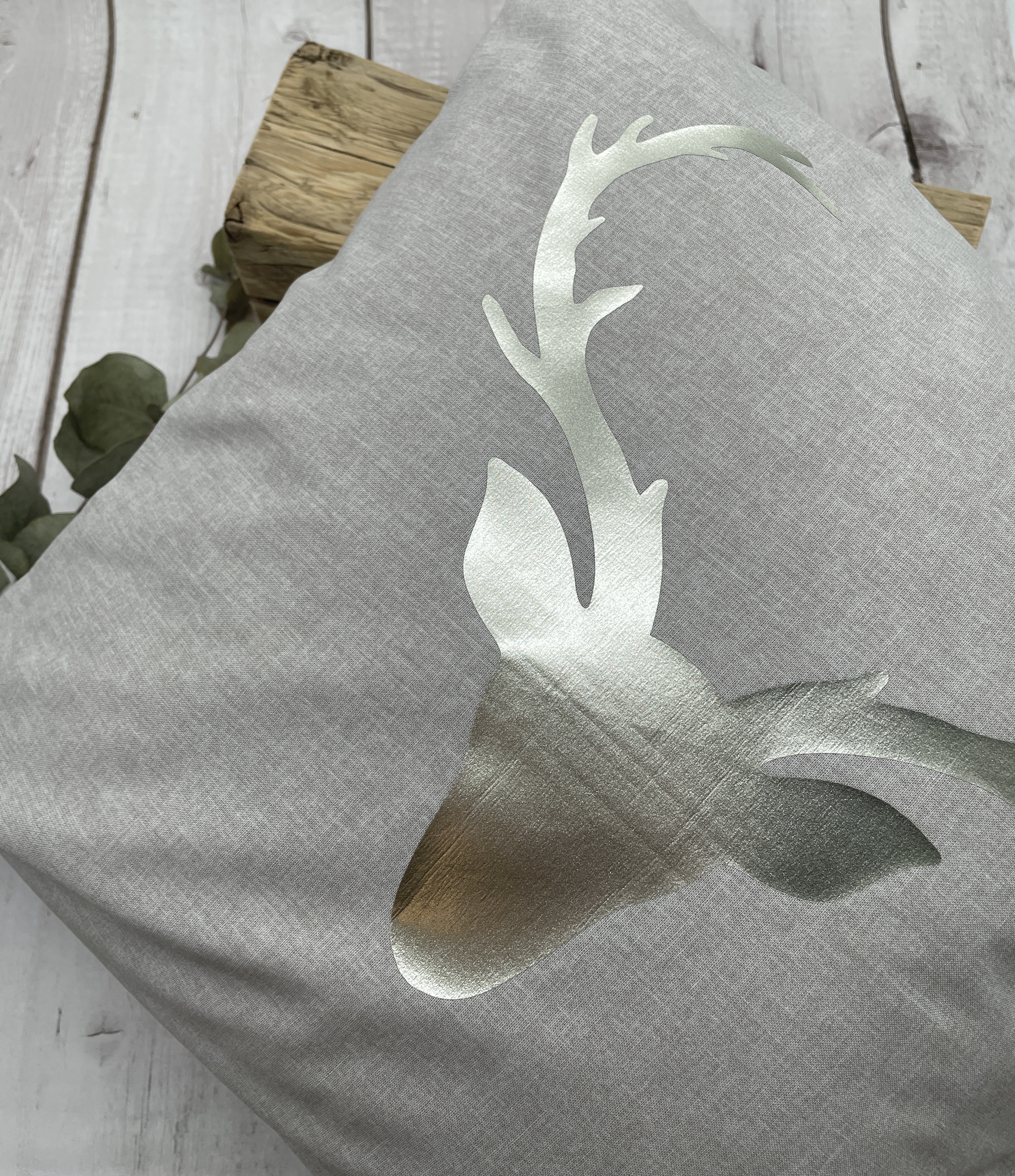 Durch den grau-melierten Baumwollstoff wird das Kissen farblich zu einem winterlichen Allrounder. Der Hirschkopf ist mittels Foliendruck in schimmerndem Altsilber auf der Vorderseite aufgebracht.