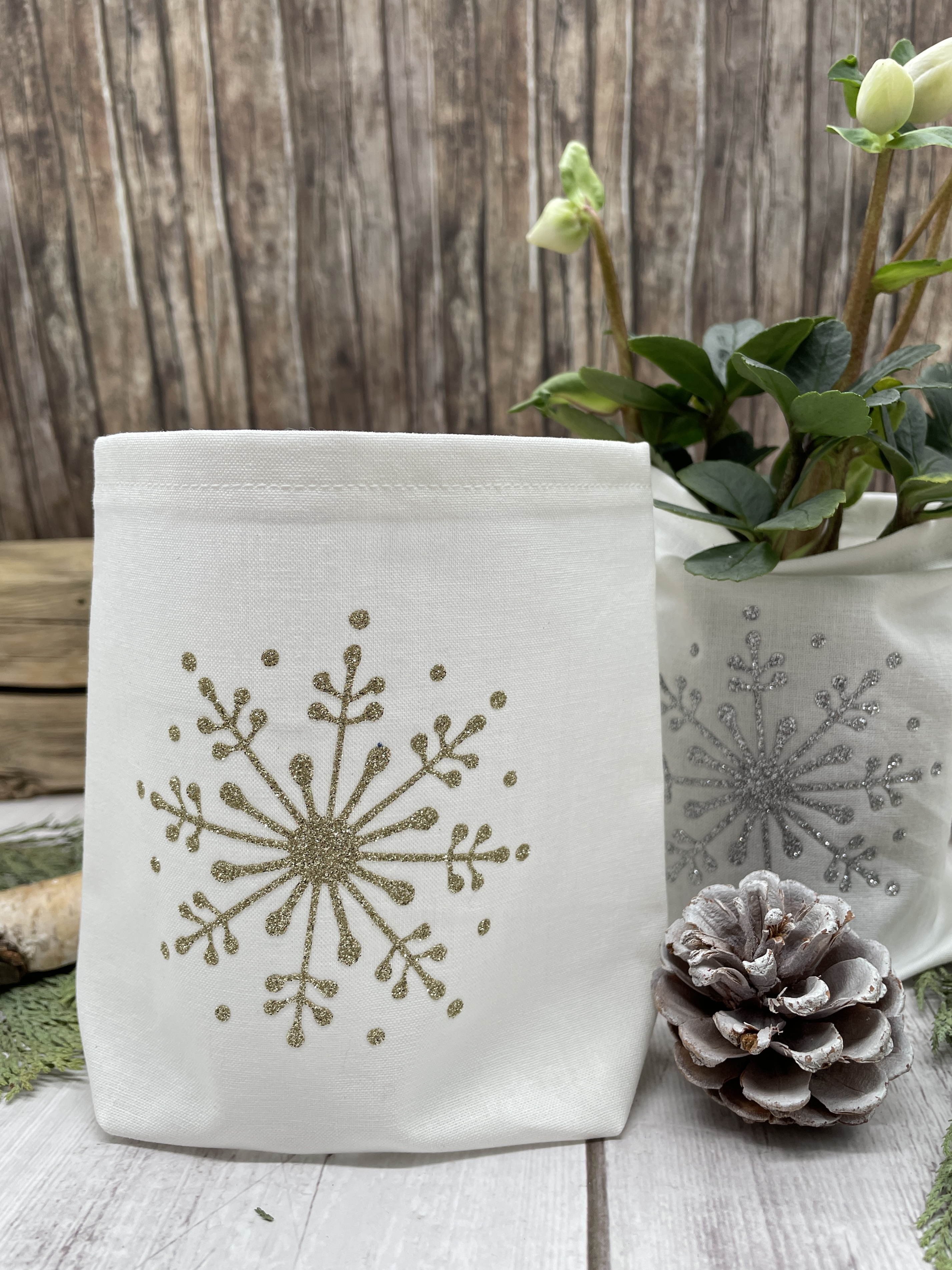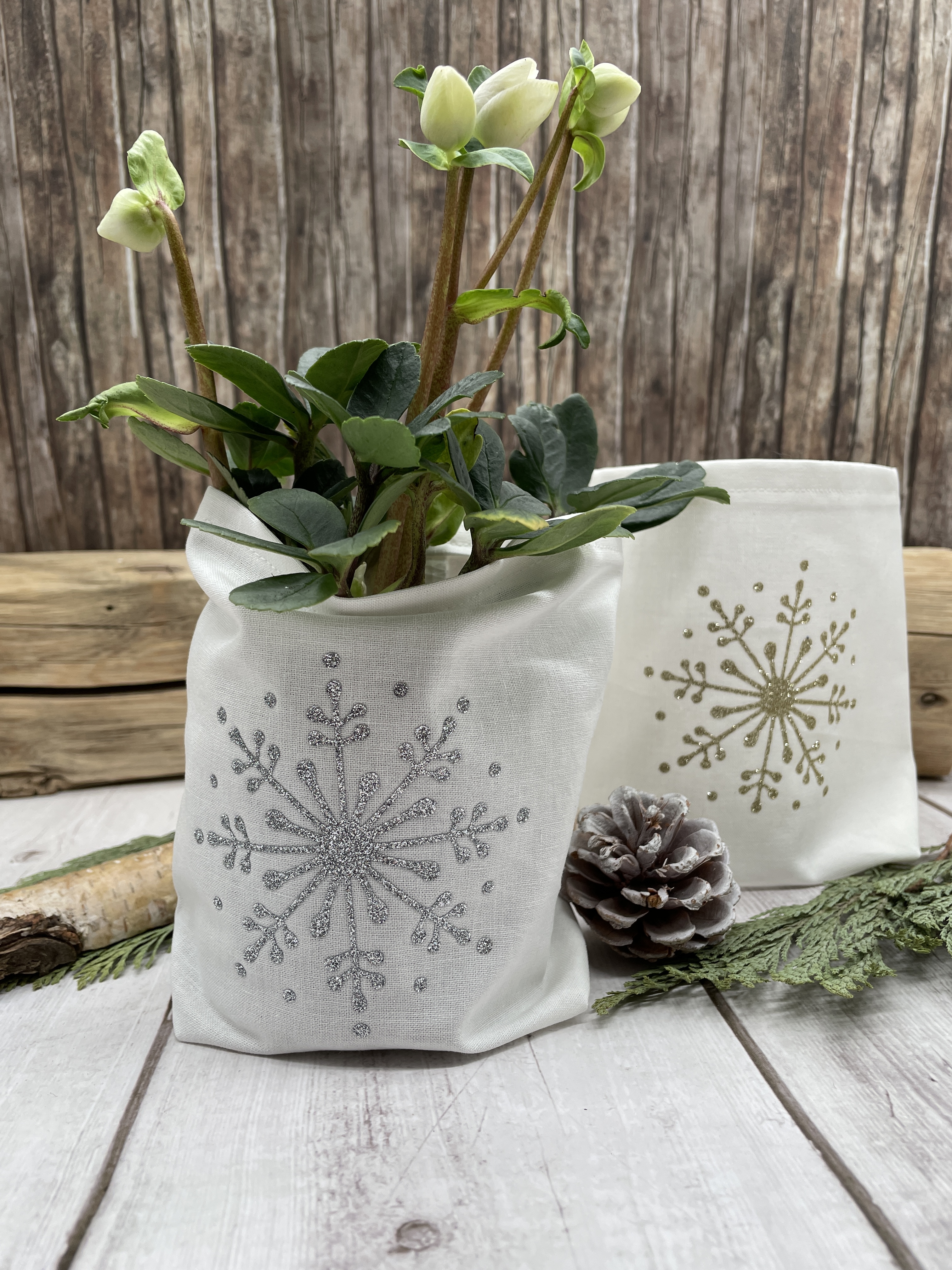 In den Beutel einfach ein Glas mit Teelicht stellen oder eine Lichterkette aufrollen und hinein legen. Du kannst auch die unschöne Blumenvase von Tante Gerda hineinstellen und verschwinden lassen - mit ein paar Tannenzweigen zauberst Du ganz schnell eine winterliche Deko.